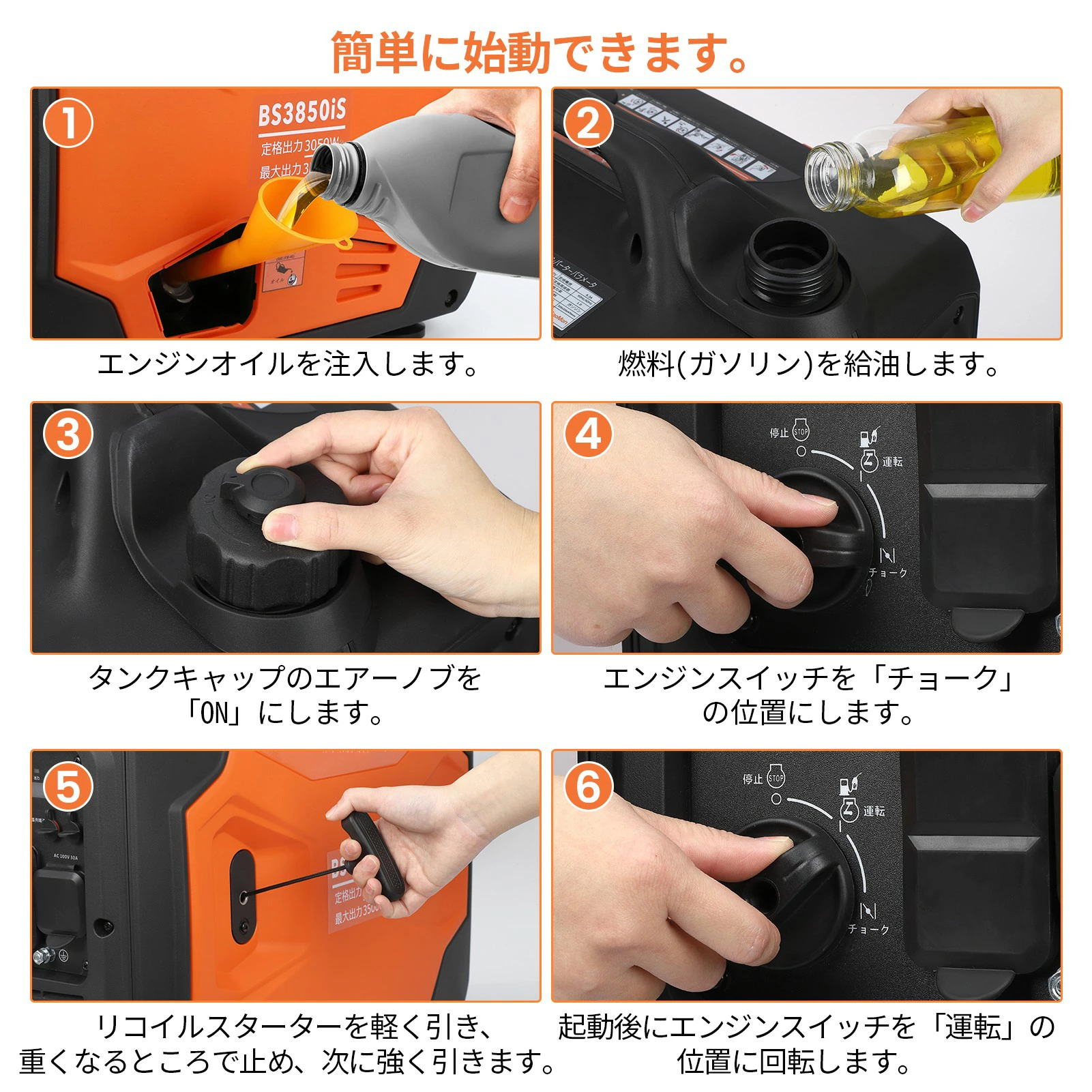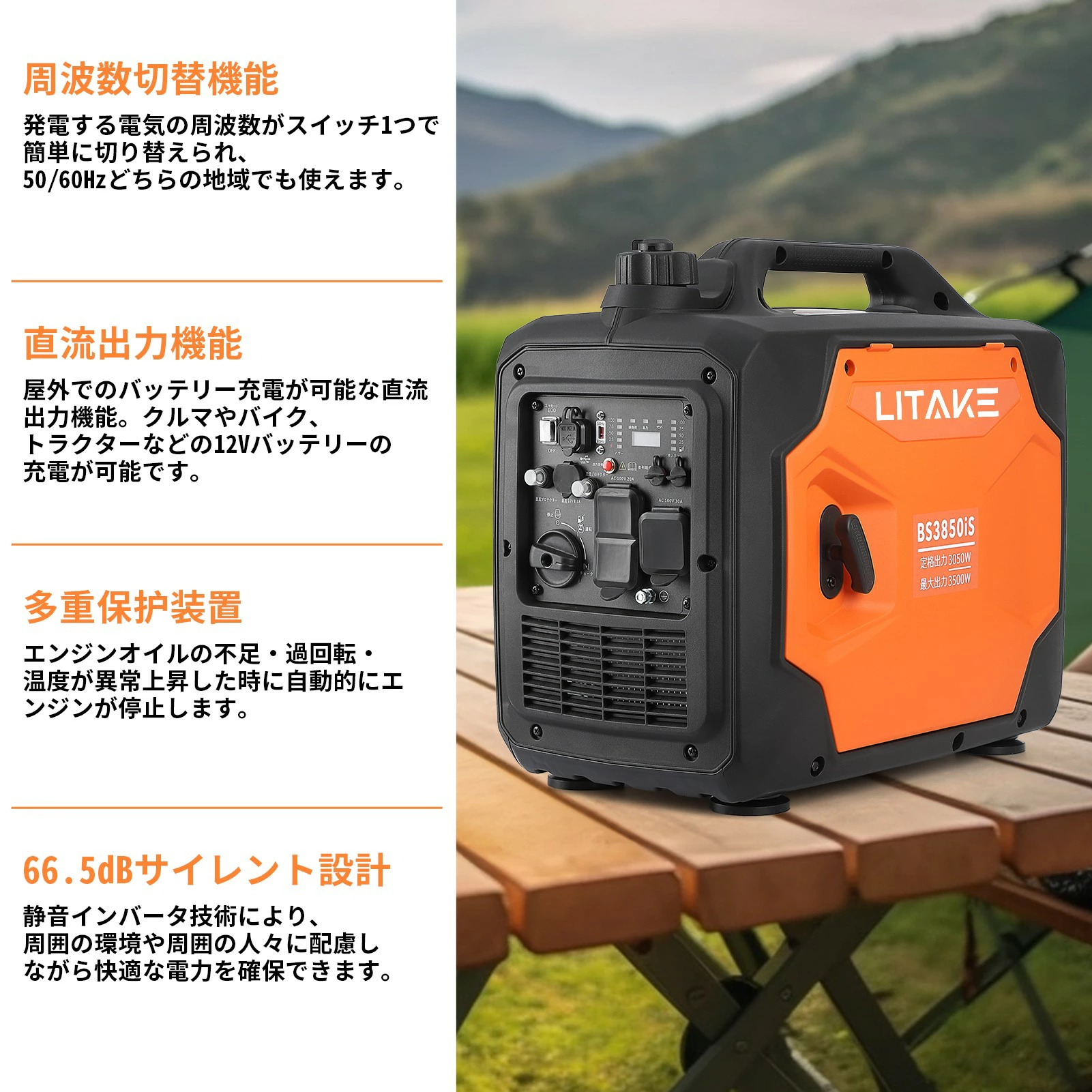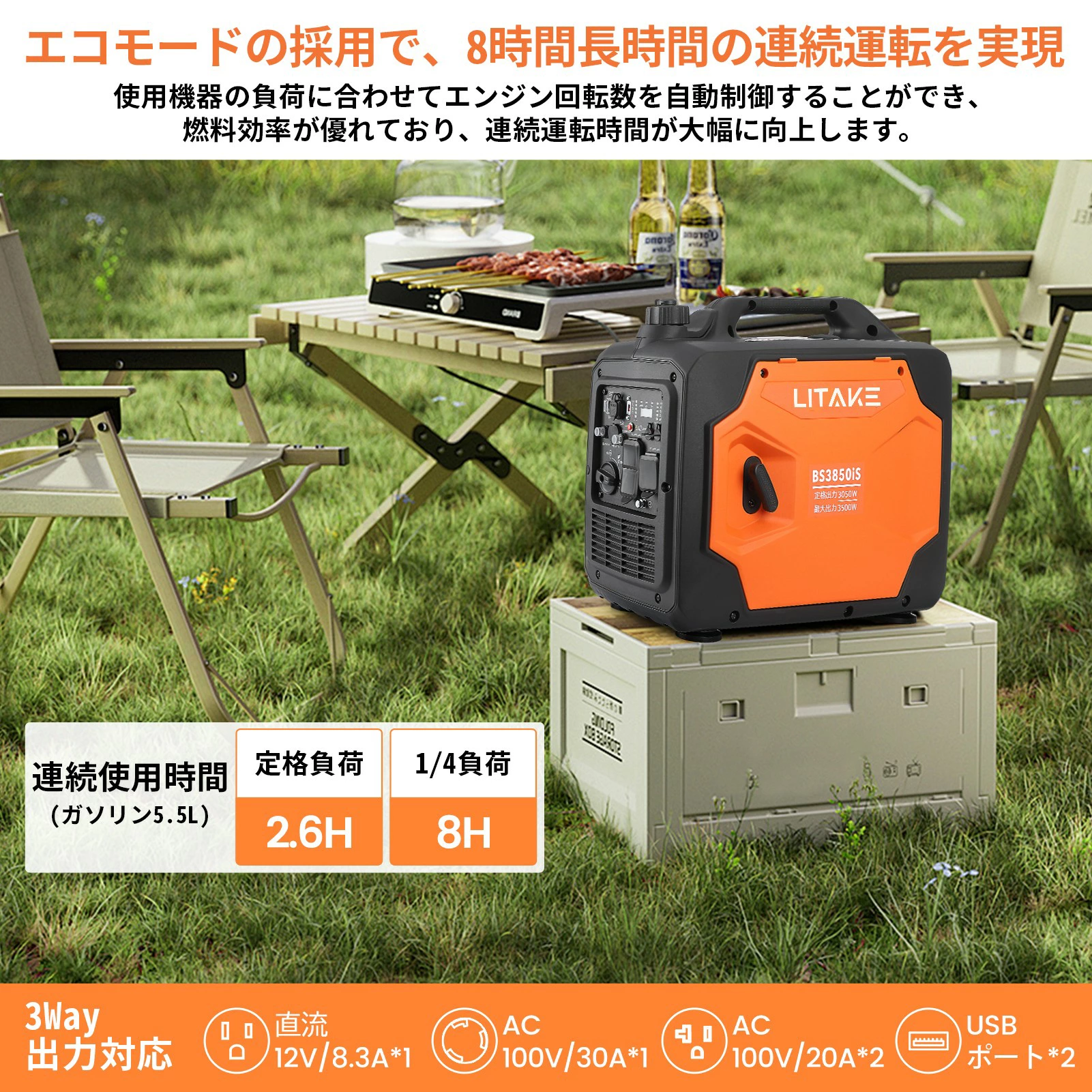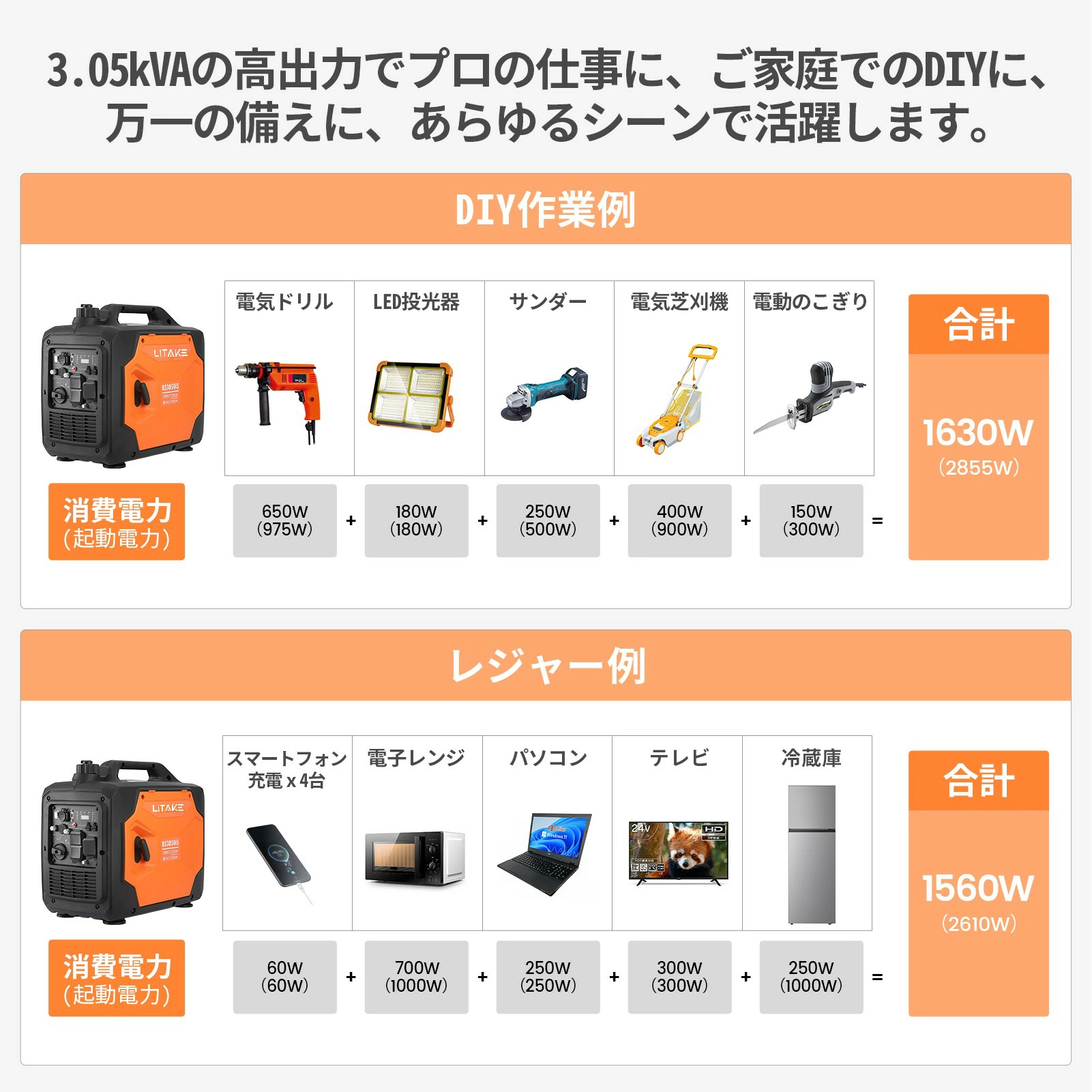 | おすすめポイント | 安定した電力、自由な発電。インバーター発電機があれば、いつでもどこでも快適な電源を手に入れよう。 【最大3.5kVA高出力】 定格出力3.05kVA、最大3.5kVAの高出力で、冷蔵庫、炊飯器、電子レンジ、エアコンなどの大型家電や、建設工事、内装工事で使用されるハンマードリルや電気丸ノコなどの高負荷の電動工具にも対応しています。発電効率を更に向上させています。軽量な設計でわずか23.5kgなので、持ち運びが楽です。 【高品質な正弦波電力&エコモードで長時間運転】 【簡単操作&多機能液晶パネル搭載】 【多重保護装置&並列接続可能】 【低騒音設計&幅広い用途】 |