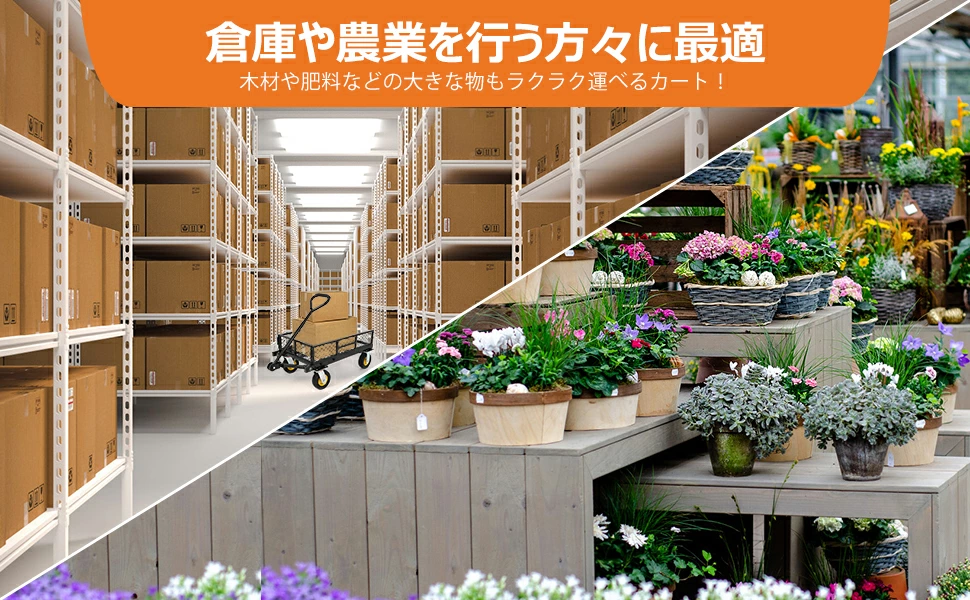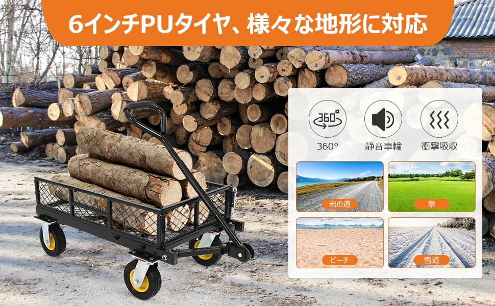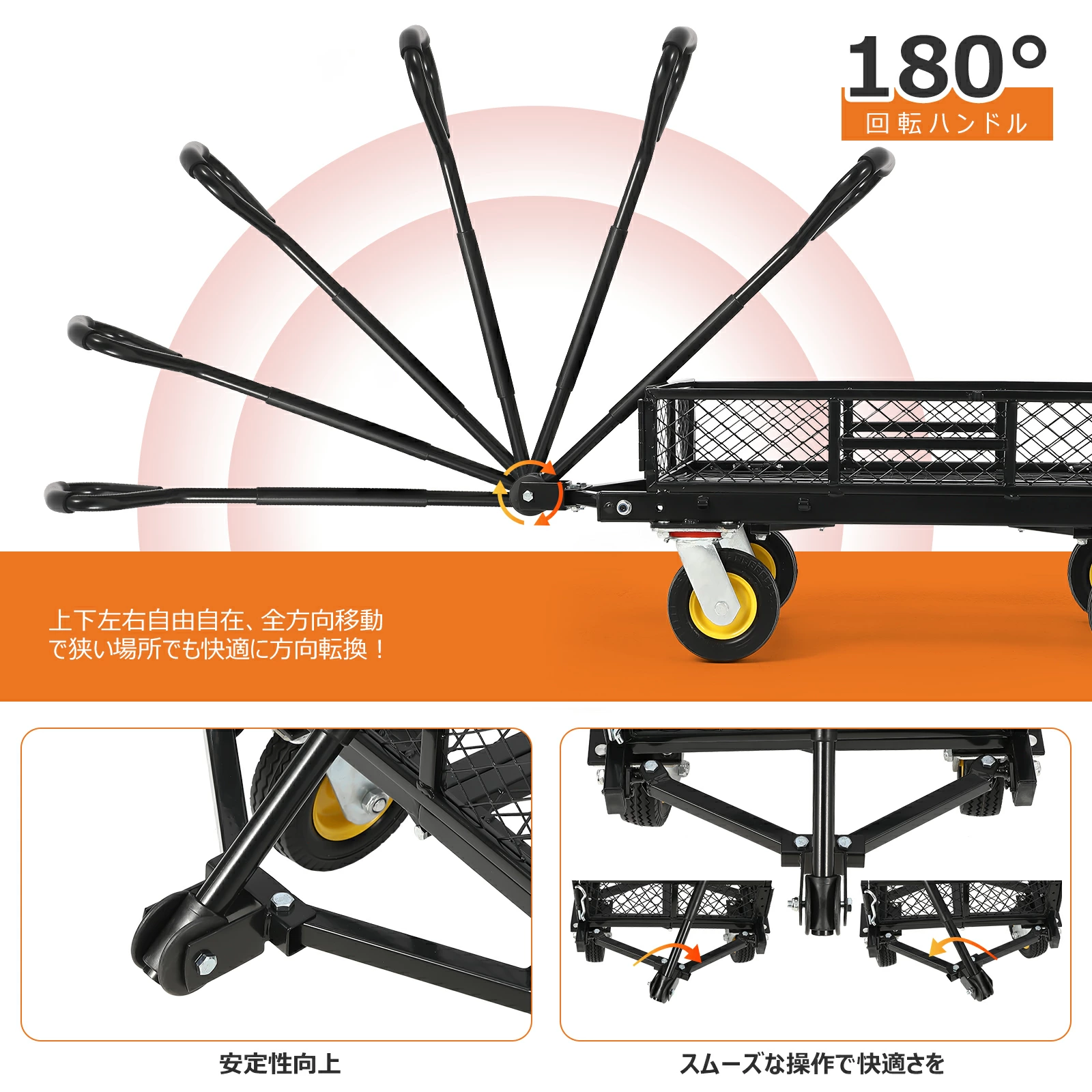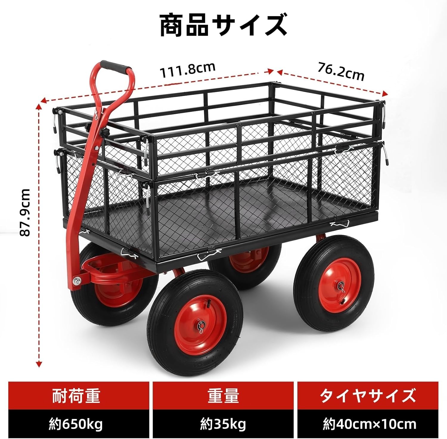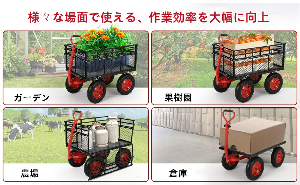 | おすすめポイント | あらゆる地形での使用に適しています。 【多機能折り畳みカゴ台車】 【優れた操作性】 【長い物も運べる機能性】 【大型空気ダイヤ】 |