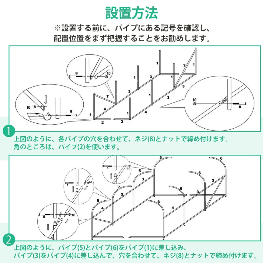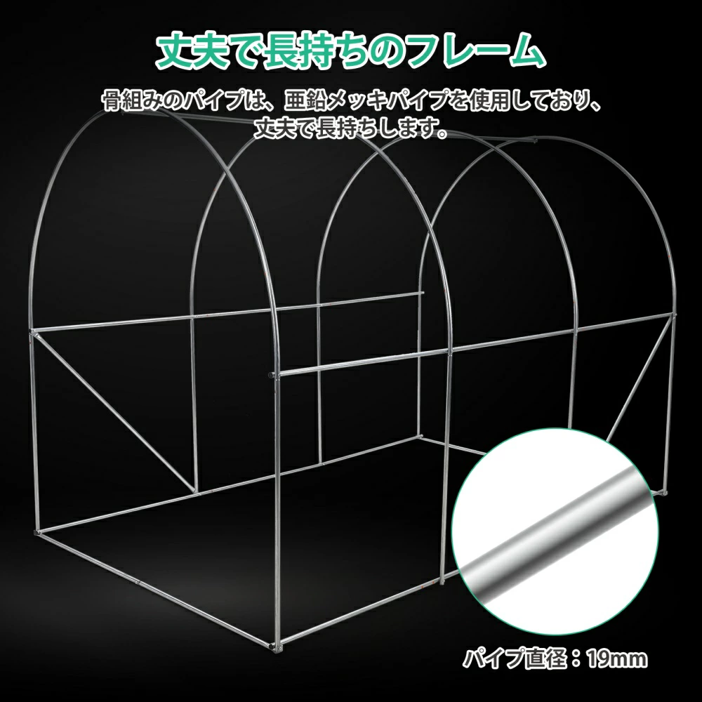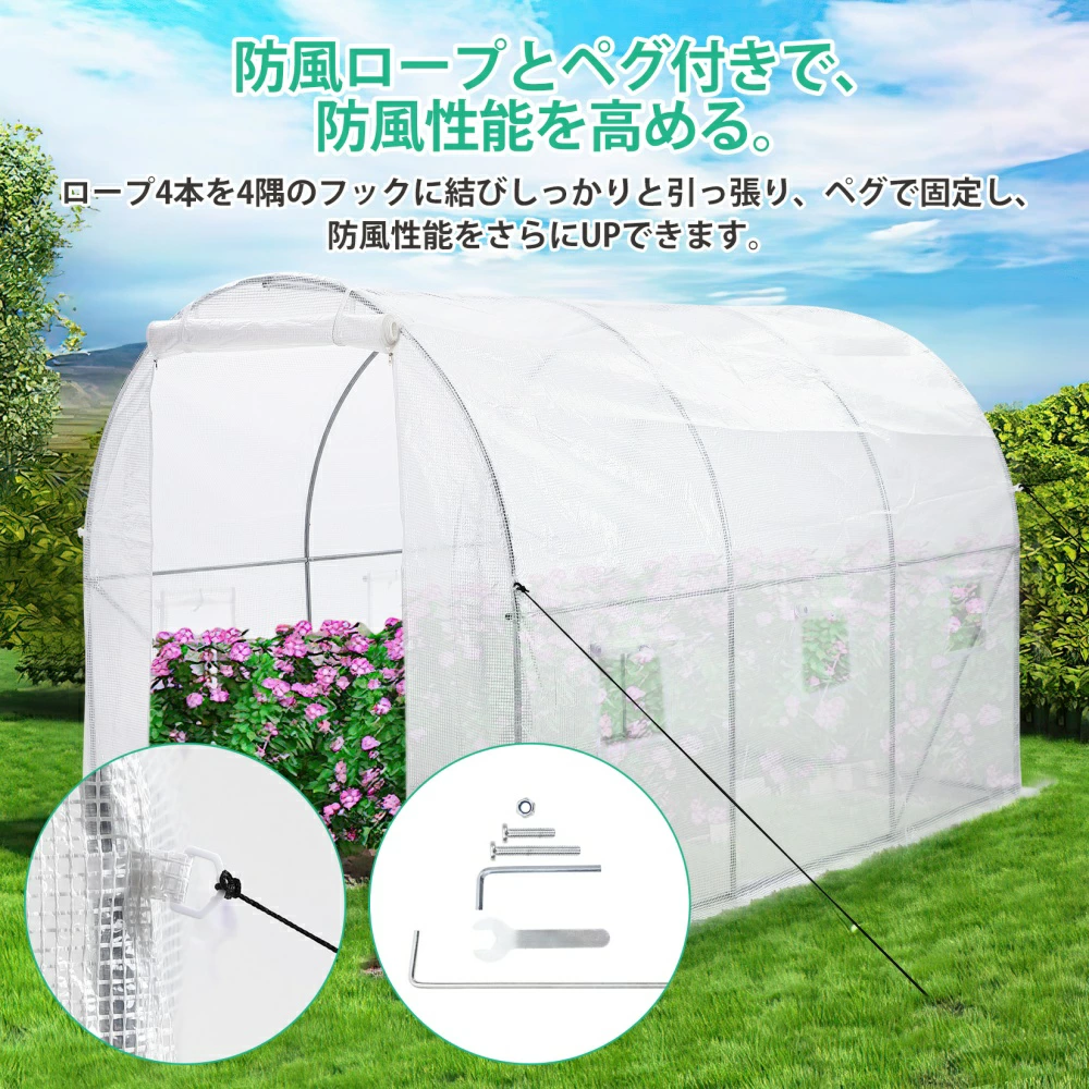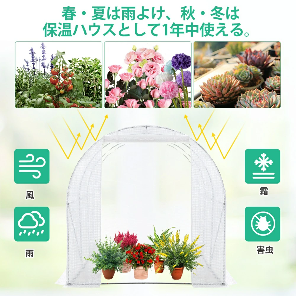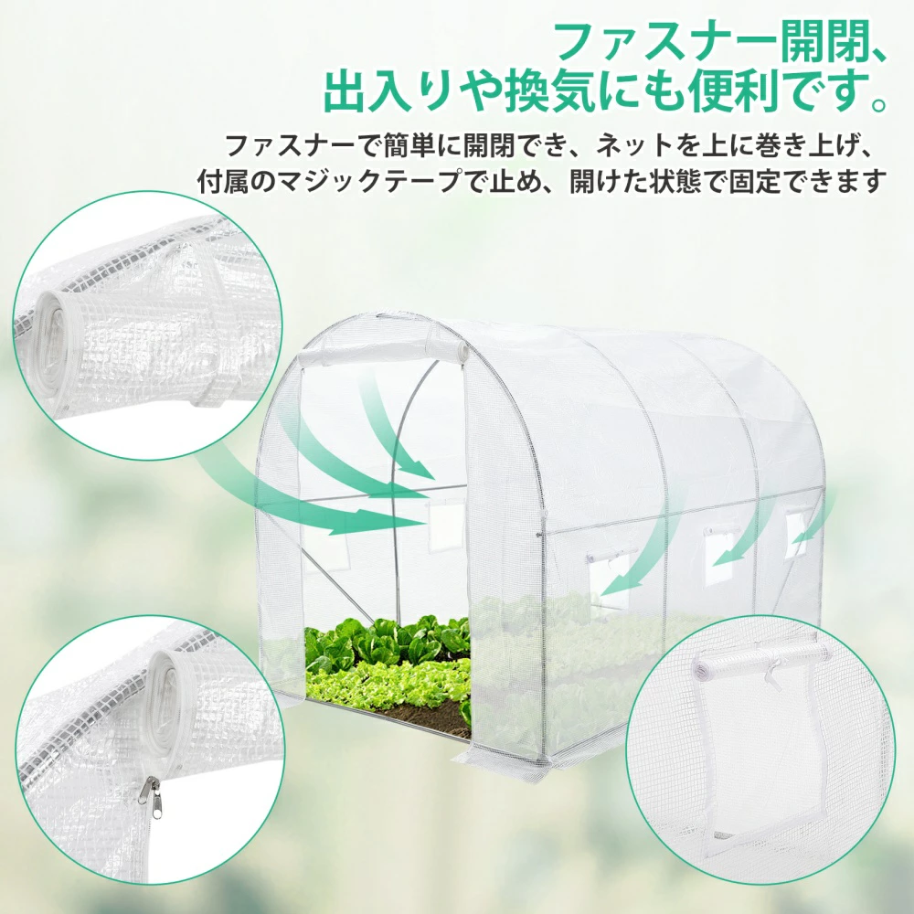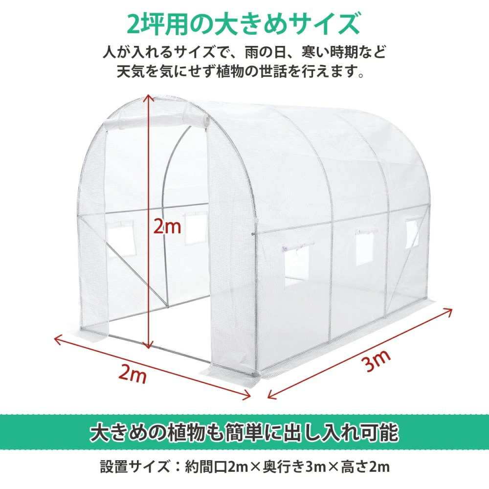 | おすすめポイント | 農業用大型ビニールハウスで大切に育ててきた植物や野菜を、寒い冬にもしっかり守りましょう。 【本格的な家庭用温室】 【2坪用の大きめサイズ】 【六つの面ファスナー付き窓】 【防風ロープとペグ付き】 【組立簡単】 |