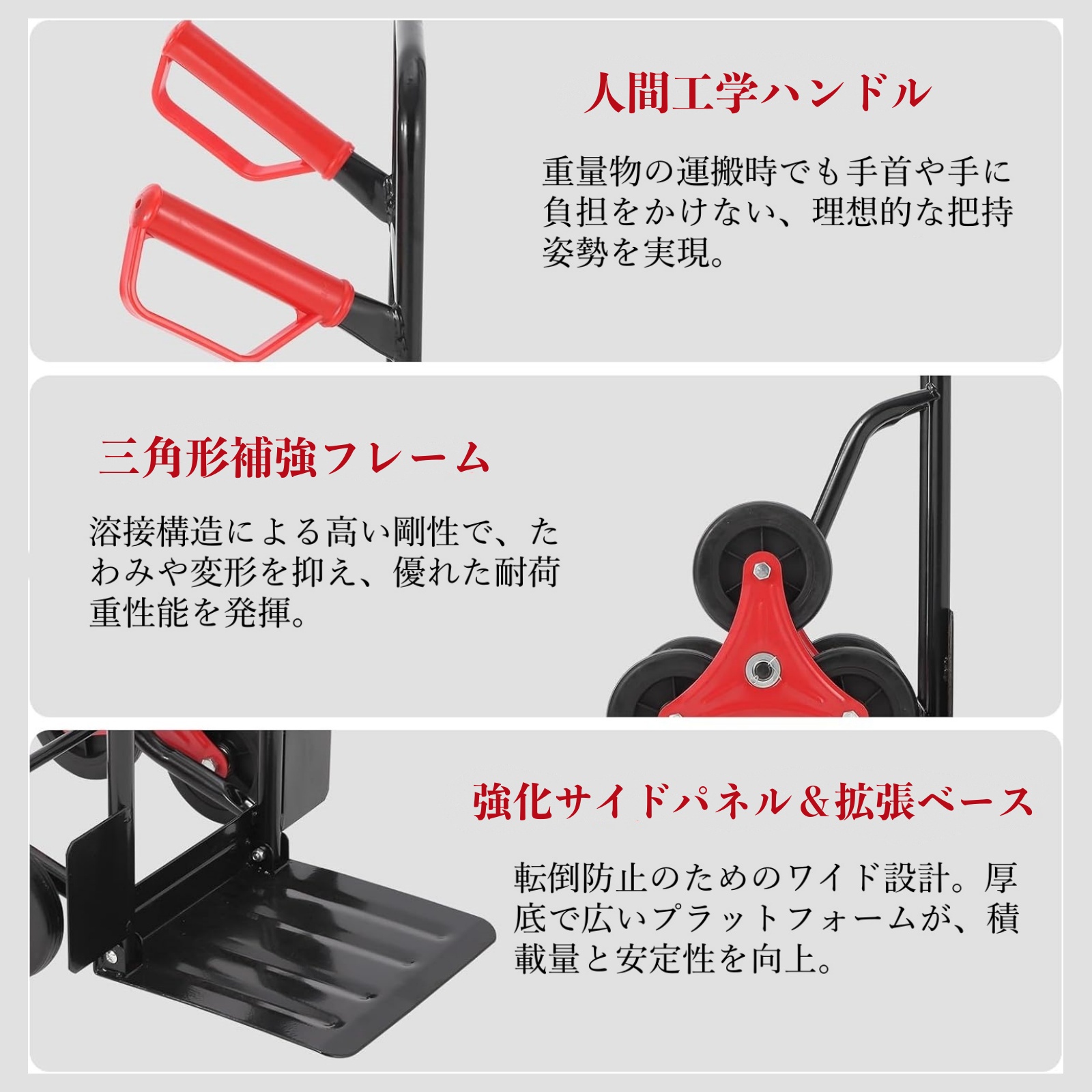 人間工学ハンドル重量物の運搬時でも手首や手に負担をかけない、理想的な把持姿勢を実現。