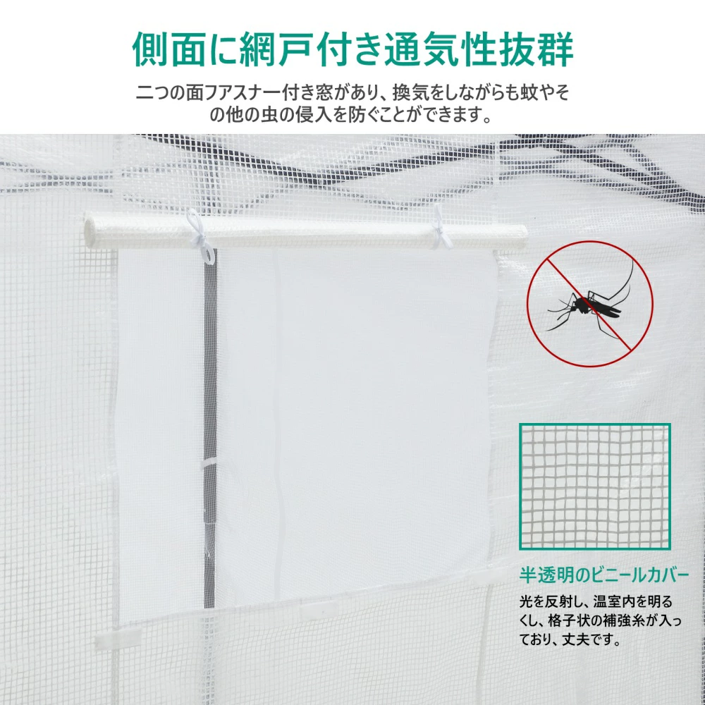 | おすすめポイント | 農業用大型ビニールハウスで大切に育ててきた植物や野菜を、寒い冬にもしっかり守りましょう。 【簡単組み立て・高さ3段階調整】 【広々とした2.7坪用の大きめサイズ】 【最適な温度管理と通気性】 【高品質な素材】 【多機能で便利】 |