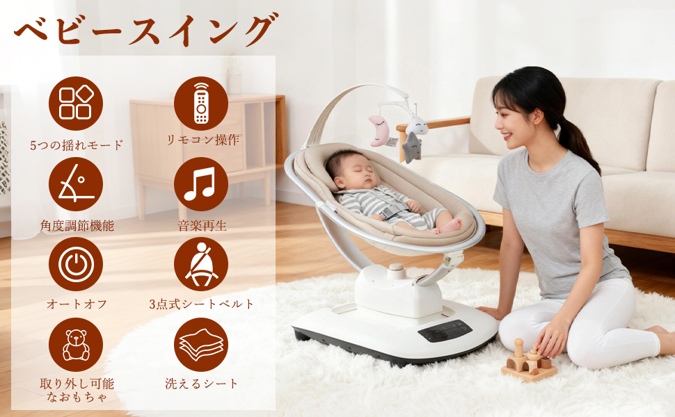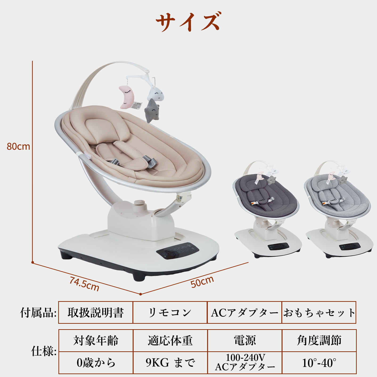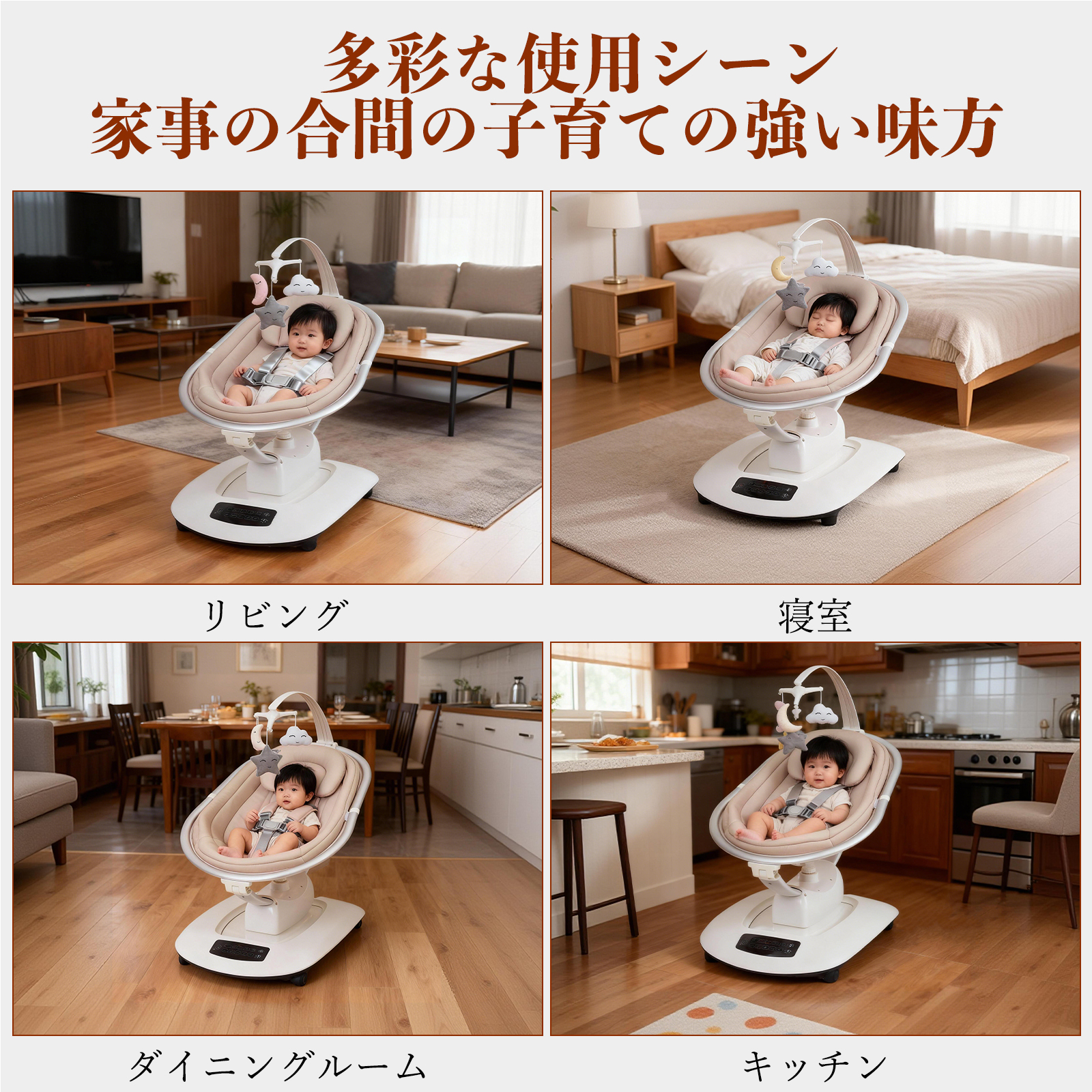 おすすめポイント | 【5モード揺れ&Bluetoothでスマート育児】 【10°–40°無段階リクライニングで快適サポート】 【30分自動オフ&安心設計で使い続けやすく】 【安心素材 & 丸洗いで清潔に】 【出産祝いのギフトに最適なデザイン】 |