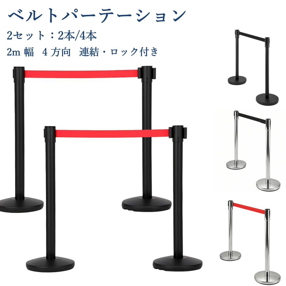 ベルトパーテーション 4方向連結可能 自動巻取り 伸縮ベルト(最長2m) ガイドポール 組立簡単 待機列整理・イベント規制・誘導用