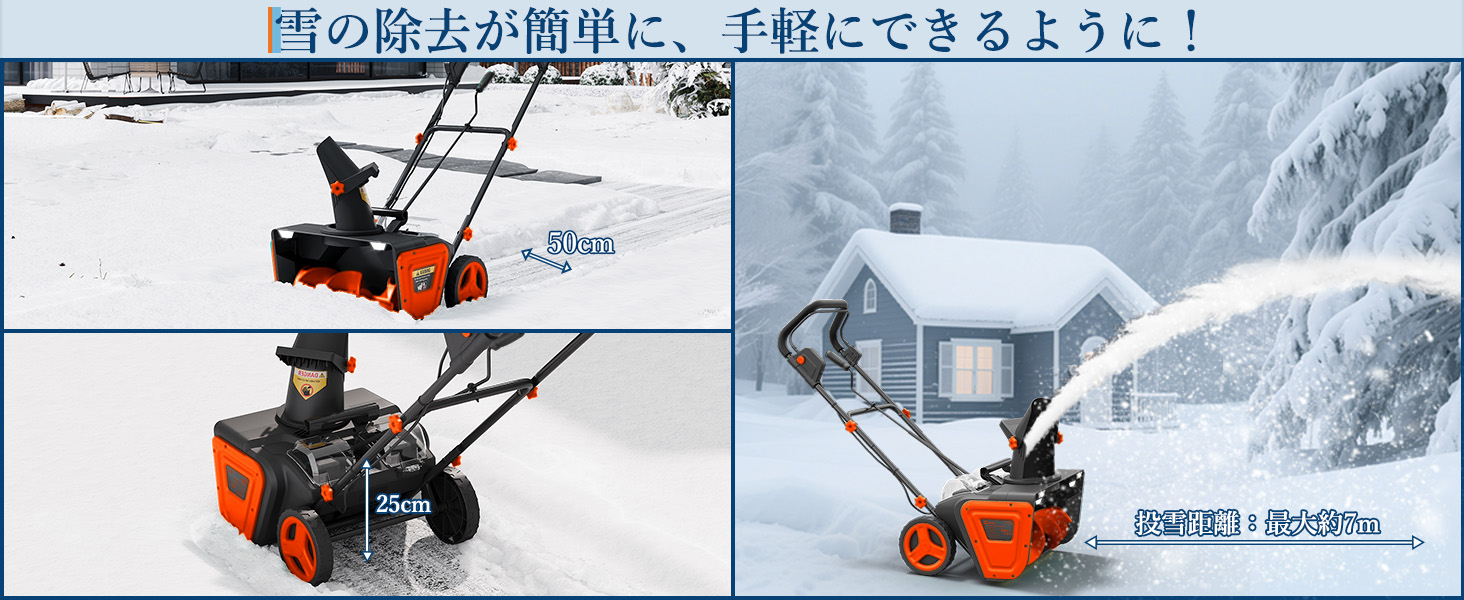 除雪幅50cmと投雪距離最大7mの広範囲を一度にカバーします。